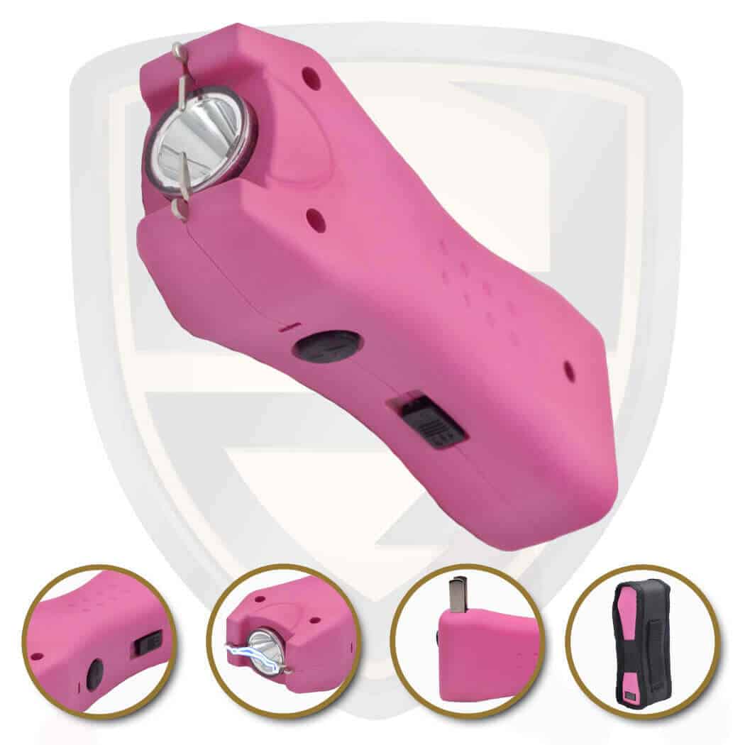 DEPENDABLE: The outer body of the compact stun gun is made from a pink molded polymer plastic for style and durability with a pink rubber coated finish. The high lumen led flashlight is furnished with a long-life low battery drain 100,000-hour bulb that is covered by the lifetime warranty. The compact size of the pink stun gun polymer case offers reduced weight and durability for a lifetime of use.