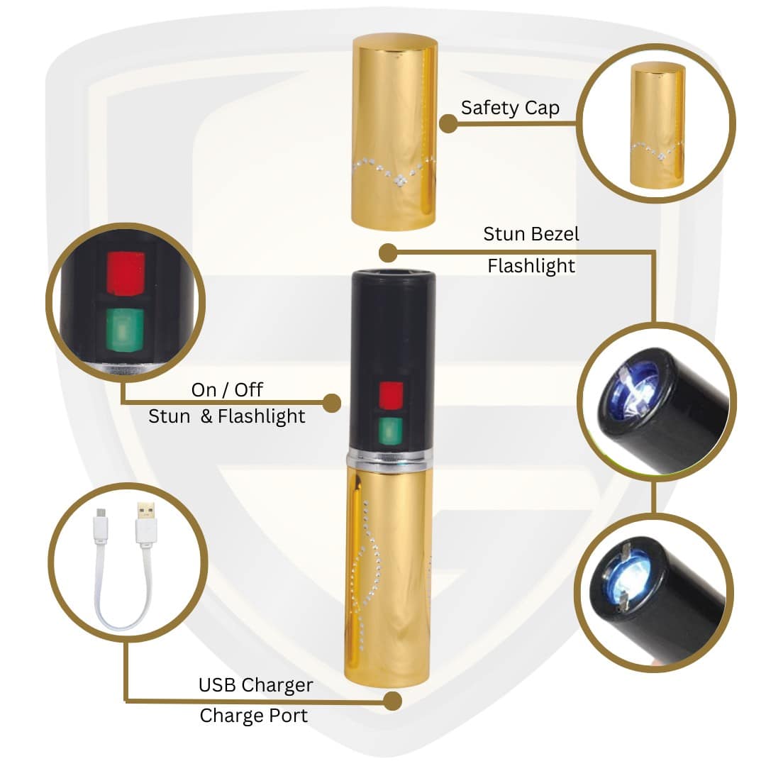 Compact rechargeable gold lipstick stun gun with flashlight. The high voltage beautiful engraved outer aluminum lipstick perfume container offers discrete personal self-defense protection that offers the element of surprise.