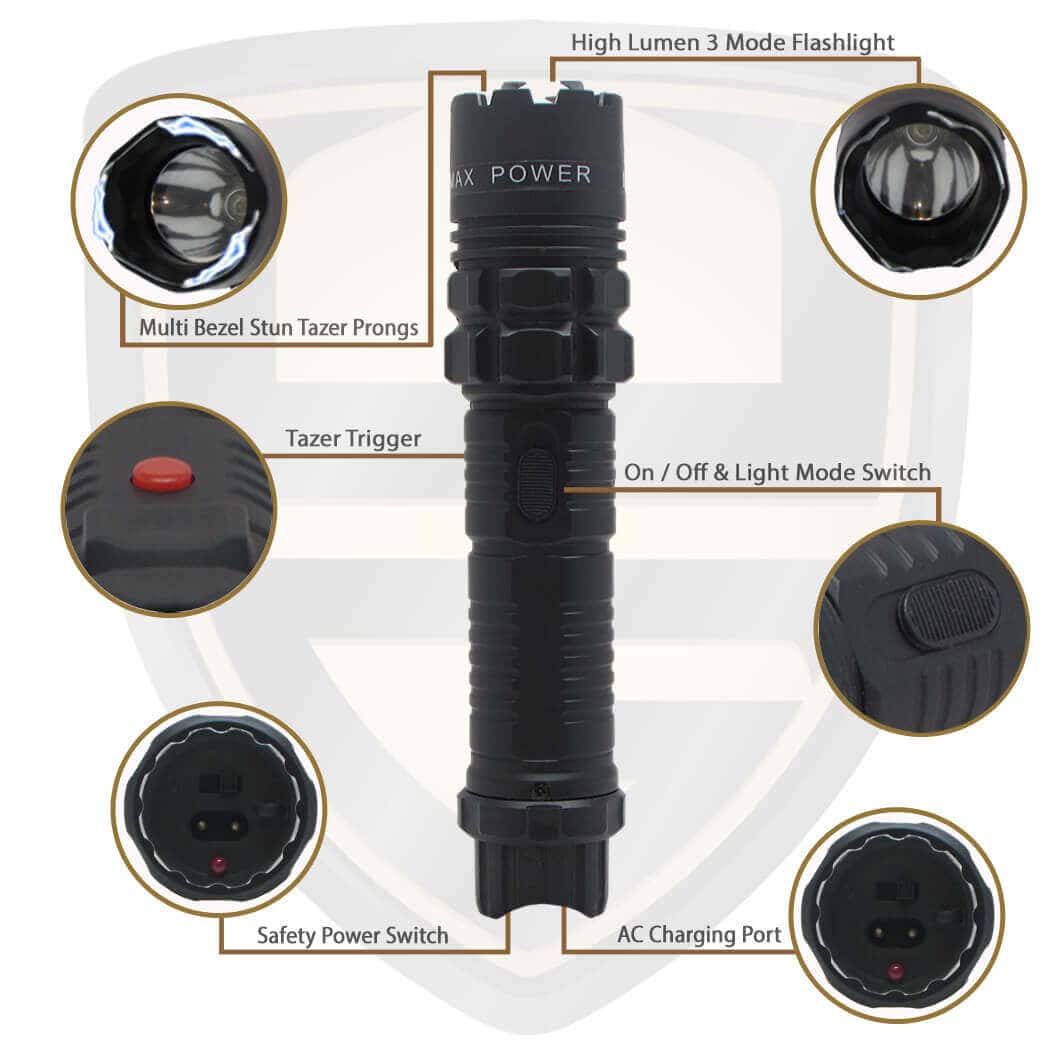 SAFETY: When it comes to safety a flashlight with stun gun is a great choice for both utility and personal self-defense. The shock proof rubber coated stun gun tactical flashlight offers a bright 125 plus lumen flashlight with a high, low and strobe light modes, and a high volt maximum power stun gun built into the front of the flashlight bezel.