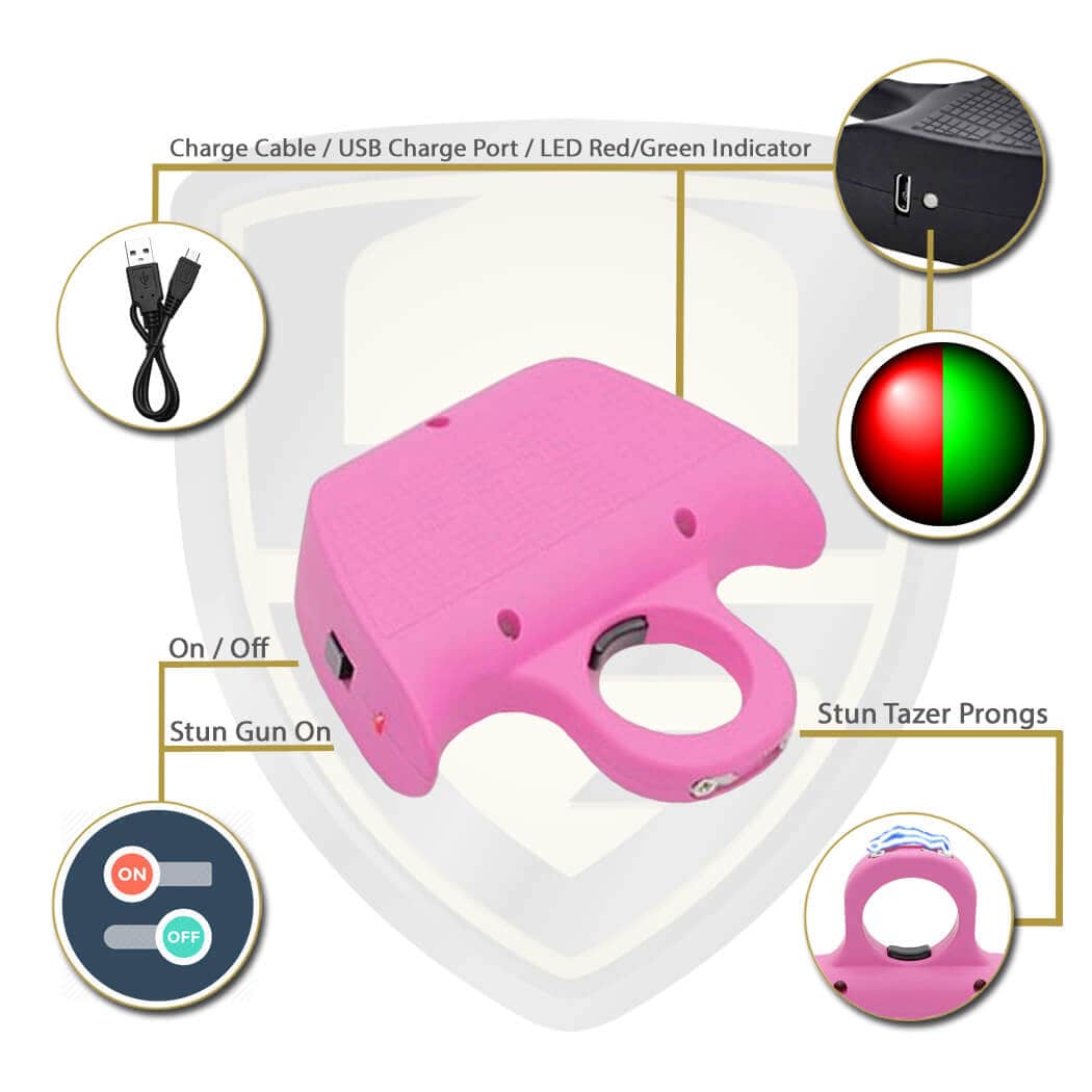 The shock ring stun gun is a small easy to conceal non-lethal self-defense pink stun gun weapon. The compact electric shock ring fits over a single finger with a wide palm base for a secure comfortable grip. It’s rechargeable with a built-in USB charger.