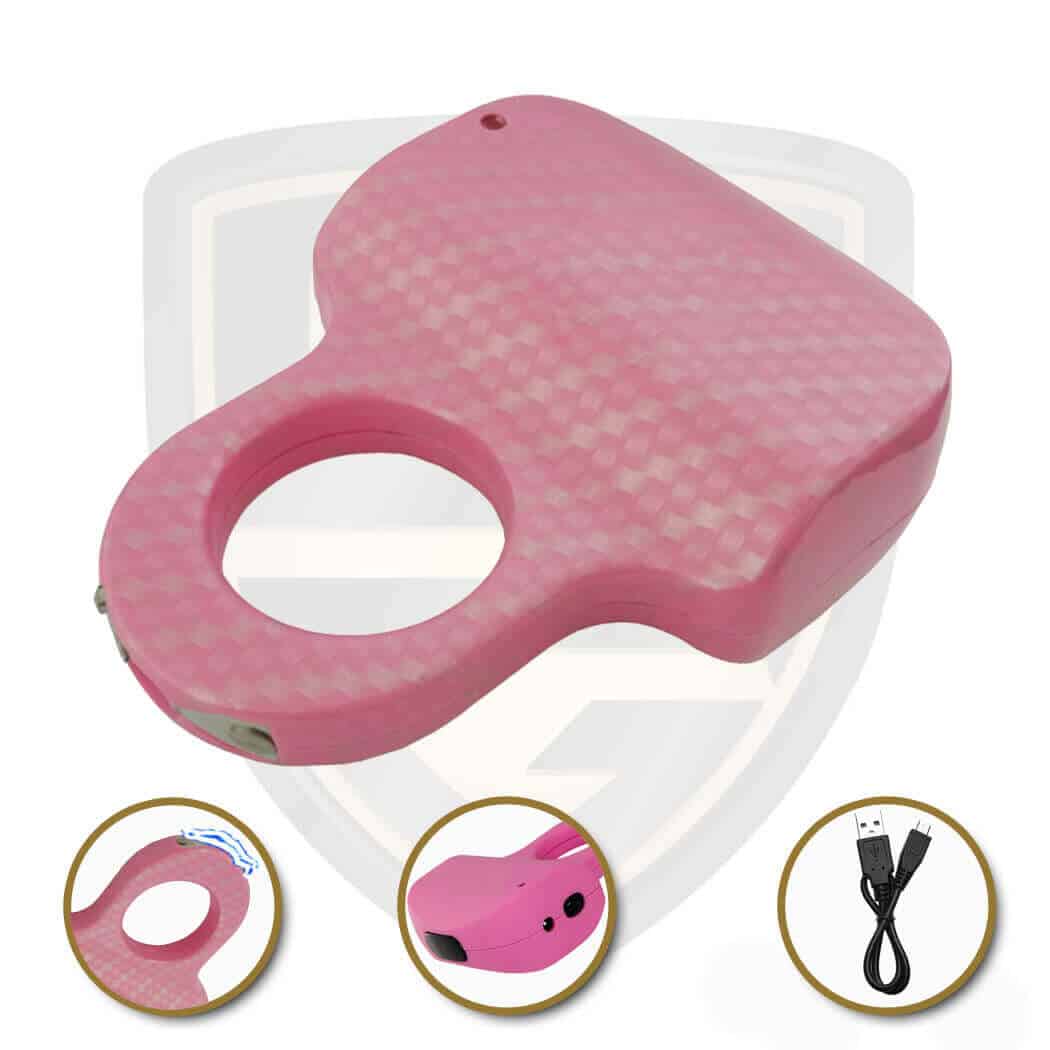 VERSATILE: When versatility is what you’re looking for in a less lethal weapon. This model offers a 100% rechargeable internal battery and is an ultra-compact. The pink carbon fiber pattern sting ring stun gun is easy to conceal and carry. It can fit in the palm of your hand, pocket, purse or backpack, so it can go where you go. This stun ring for sale is one of the smallest tazers on the market and extremely affordable to other less comparable models.