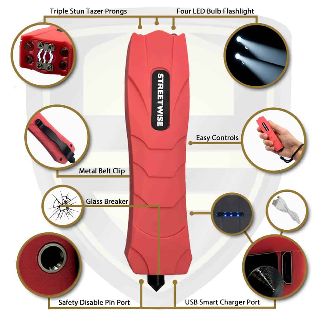 The serpent stun gun tazer is designed to be your trusted companion in personal defense when at home, taking a walk, in your car or when at the office. Its steel window breaker spike can help you escape dangerous situations, allowing you to break glass and gain access to safety quickly and efficiently. Or use the metal spike as a striking defense tool to hit an assailant with force. The outer metal mounted heavy-duty belt clip is small enough to clip on a pocket, belt, backpack or purse strap for quick access. The slim compact design has a textured molded rubber-coated outer body giving the user a comfortable nonslip grip. This streetwise stun gun model offers a true premium high-volt stun gun in a size that is easy to carry daily, and powerful enough to handle any self-defense situation.