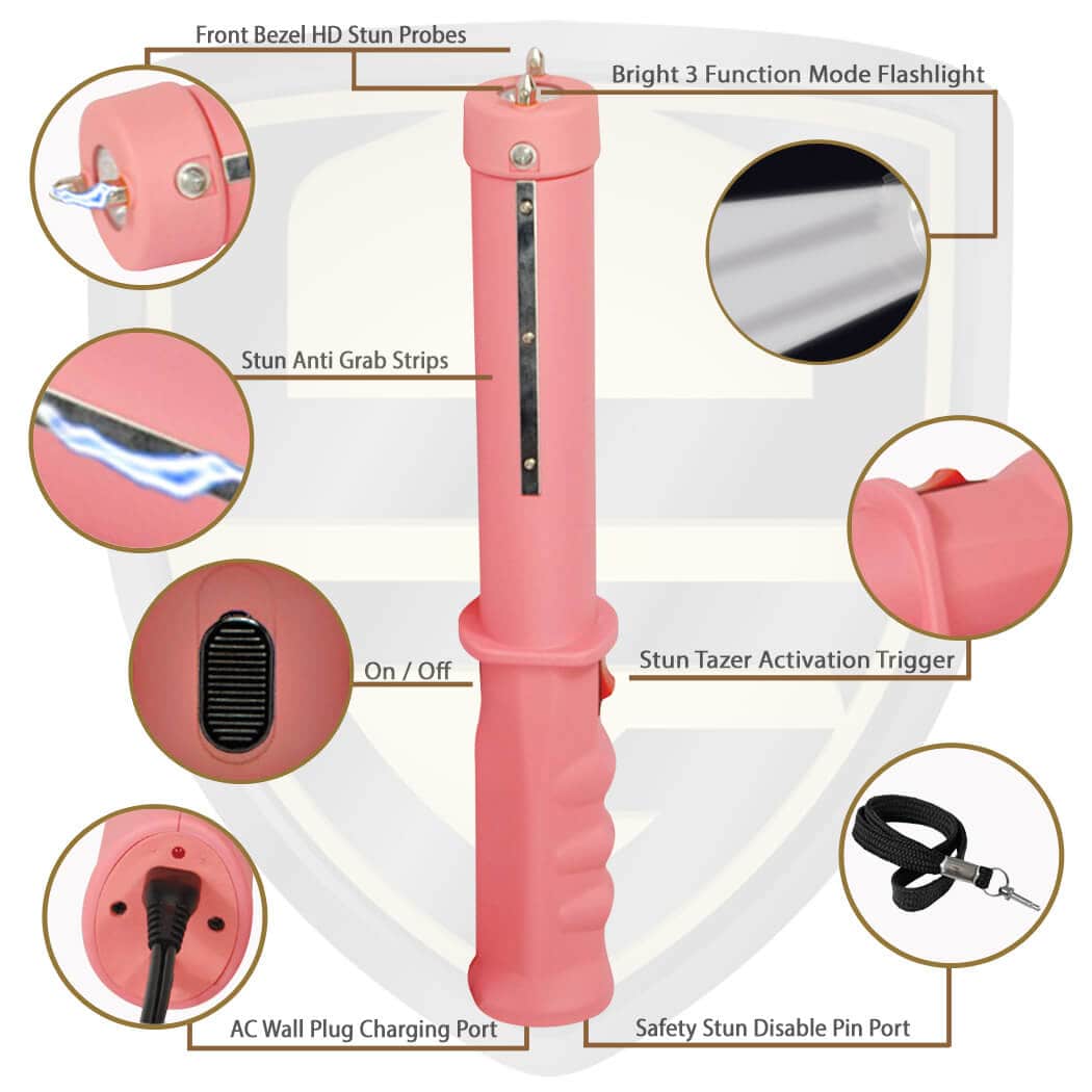 SAFETY: This model pink stun baton was designed for law enforcement for easy carry and is now available for civilian use for personal safety, security and is great for self-defense for women or men. This model is considered the best stun baton for its lightweight compact design for a self-defense stun baton. It includes front bezel stun prongs with side stun grab strips along with a wrist strap disable pin safety feature that deactivates the tazer feature when the pin is removed, and yes it comes in pink.
