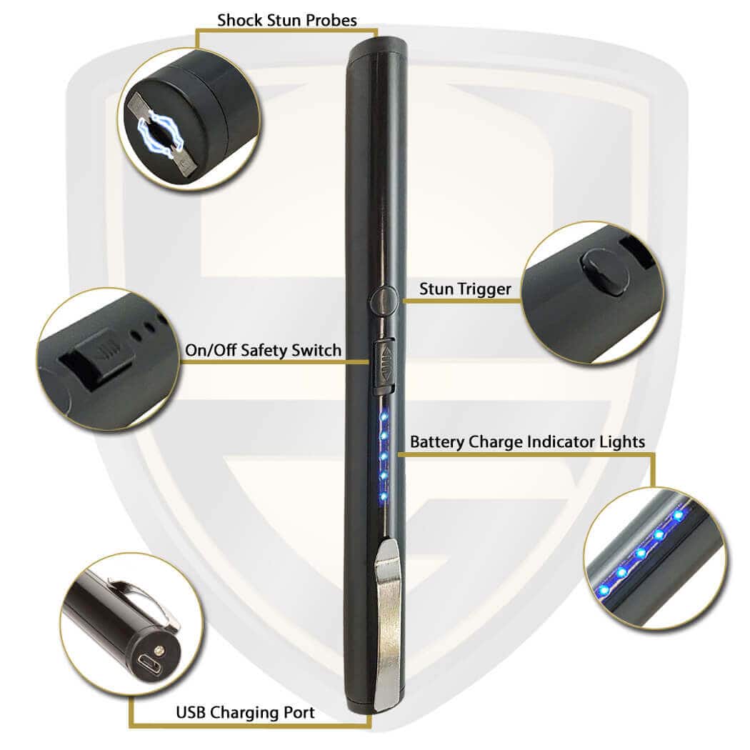 IMPRESSIVE: This model stun gun pen design is discrete and powerful. The slim design fits all size hands, while being easy to conceal giving you the element of surprise when using the stun gun pen to defend yourself. This is a great self defense weapon for women and men. You get a powerful taser pen in a small package with designer colors like metallic black, blue and purple.