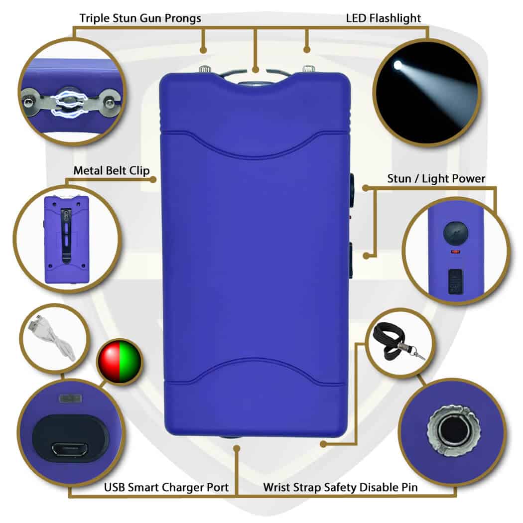 The NEW and Improved stun gun with disable pin design has been popular for over two decades. This traditional rectangle mini stun gun design has been a reliable choice as a self-defense weapon. Now more powerful, with upgraded technology like the safety disable pin feature to prevent accidental discharge. This multi-function disable pin stun gun is easy to use and handle. Features include a bright LED flashlight for emergencies, metal belt clip for easy carry, and the new USB rechargeable smart charging system.