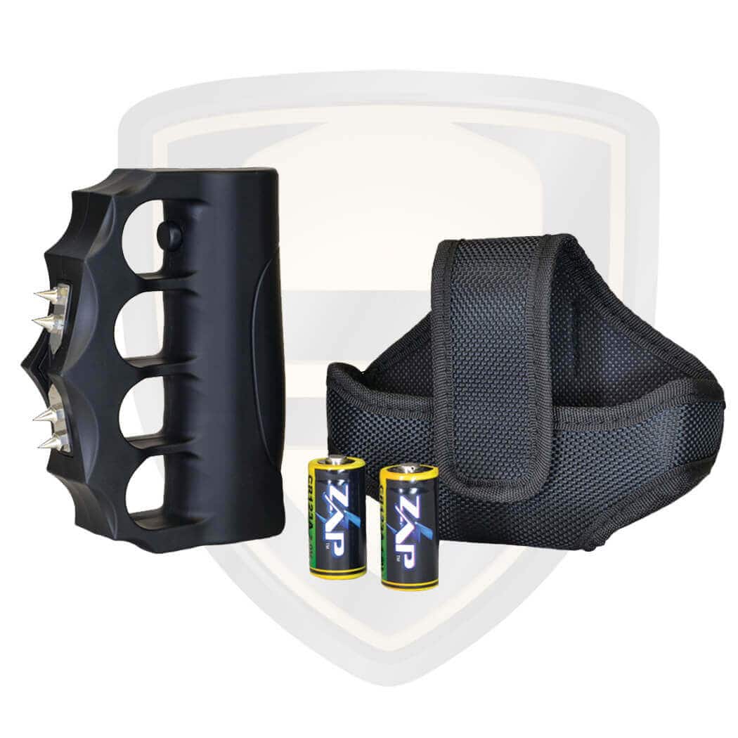 VERSATILE: The aggressive design of the extreme blast knuckle stun gun offers durability and quality. The ZAP stun gun was designed with one function and that is to defend yourself. The extreme ZAP knuckles is a non-rechargeable stun gun that is powered by two CR123A high capacity lithium batteries for a consistent voltage and milliamp output that delivers maximum stopping power. This model fits most size hands comfortably. The ZAP Stun Gun Brand is a leader in stun shock less lethal self-defense weapons.