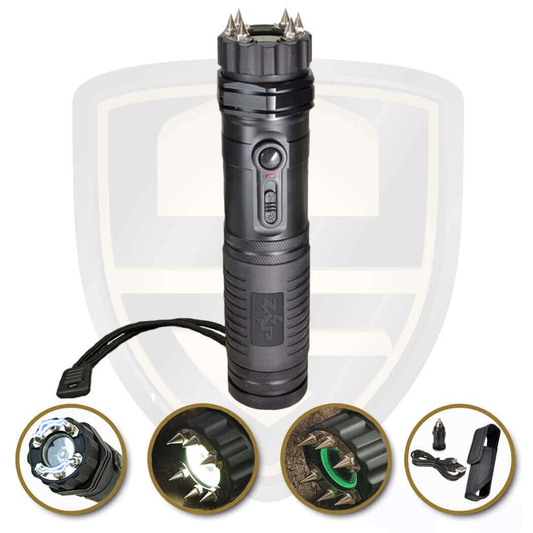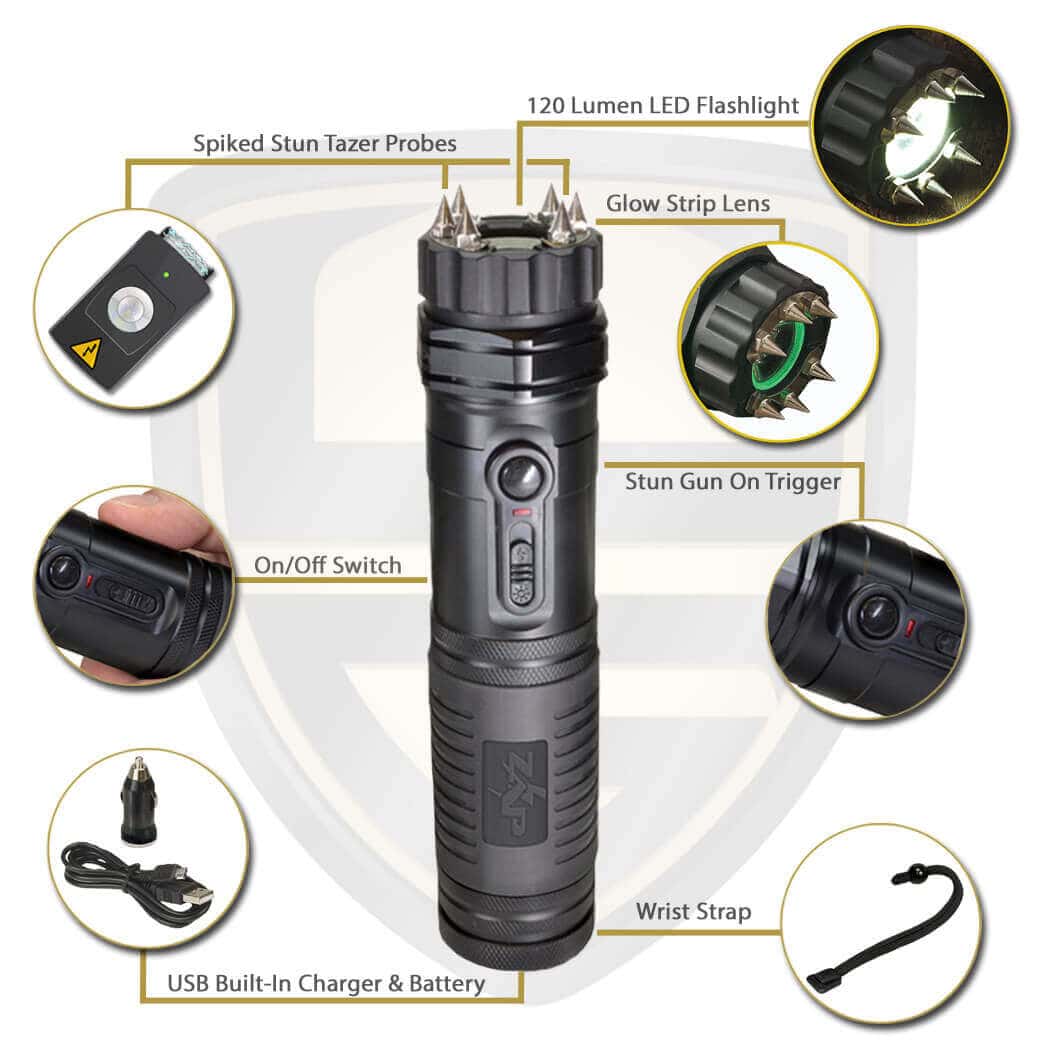 SAFETY: The zap light extreme stun flashlight is a durable aggressive designed extreme flashlight for professional and personal protection and self-defense. The zap stun gun flashlight is a high volt flashlight taser with a bright 120 lumens flashlight. This US patent design US D611,115S and USD 690,188S stun gun offers sharp bezel spikes to penetrate thick clothing with an exclusive glow strip bezel for easy location of the zap stun gun flashlight in the dark.