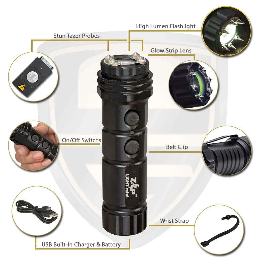 The zap light mini stun gun flashlight is a premium compact stun gun by ZAP Stun Gun. This US patent less lethal shock designed weapon by PS product stun flashlight is rechargeable and made from military grade aluminum. This is a compact stun gun self-defense weapon for men and women.